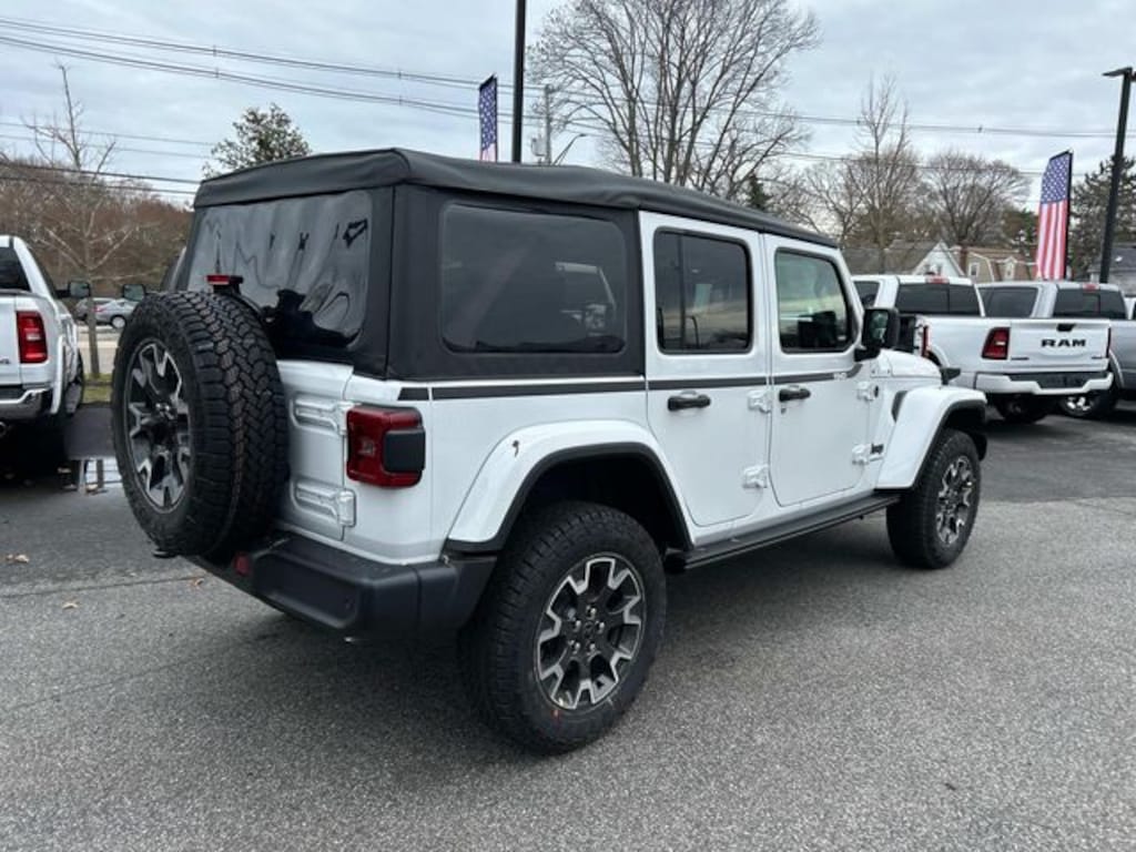 First Chrysler Dodge Jeep is delighted to offer this great-looking and fun 2025 Jeep Wrangler Sahara in Bright White Clearcoat Beautifully equipped with Quick Order Package 24G Sahara, Safety Group (Auto High Beam Headlamp Control, Blind Spot & Cross Path Detection, and ParkSense Rear Park Assist System), 110 MPH Vehicle Max Speed Calibration, 3.45 Overall Top Gear Ratio, 4-Wheel Disc Brakes, 4G LTE Wi-Fi Hot Spot, 8 Speakers, ABS brakes, Air Conditioning, Alloy wheels, AM/FM radio: SiriusXM, Apple CarPlay, Apple CarPlay/Android Auto, Automatic temperature control, Aux Battery, Brake assist, Cloth Low-Back Bucket Seats, Compass, Connectivity - US/Canada, Cruise Control, Delay-off headlights, Driver door bin, Driver vanity mirror, Dual front impact airbags, Dual front side impact airbags, Electronic Stability Control, Emergency communication system: Jeep Connect, Front anti-roll bar, Front Bucket Seats, Front Center Armrest w/Storage, Front dual zone A/C, Front fog lights, Front License Plate Bracket (DISC), Front reading lights, Fully automatic headlights, Google Android Auto, Heated door mirrors, Heated front seats, Heated steering wheel, Heavy Duty Suspension w/Gas Shocks, Illuminated entry, Integrated Center Stack Radio, Integrated roll-over protection, Low tire pressure warning, MOPAR All-Weather Floor Mats, MOPAR American Flag Hood Graphic, MOPAR Upper Body Side Graphic, Non-Lock Fuel Cap w/o Discriminator, Occupant sensing airbag, Outside temperature display, Overhead airbag, Panic alarm, ParkView Rear Back-Up Camera, Passenger door bin, Passenger vanity mirror, Power door mirrors, Power steering, Power windows, Radio data system, Radio: Uconnect 5 w/12.3" Display, Rear anti-roll bar, Rear reading lights, Remote keyless entry, Security system, Split folding rear seat, Steering wheel mounted audio controls, Stop-Start Dual Battery System, Tachometer, Telescoping steering wheel, Tilt steering wheel, Traction control, Trip computer, Variably intermittent wipers, Voltmeter, Wheels: 18" x 7.5 Machine/Painted Gray, and Wheels: 18" x 7.5" Machine/Painted Gray!