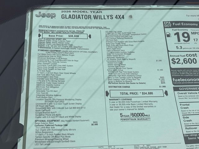 First Chrysler Dodge Jeep is honored to offer this superb-looking 2026 Jeep Gladiator Willys in Reign Beautifully equipped with Convenience Group (Air Conditioning with Auto Temp Control, Cluster 7.0" TFT Color Display, Corning Gorilla Glass, Daytime Running Lamp System, Emergency/Assistance Call, Front Door Locks 2-Door Passive Entry, Heated Front Seats, Heated Steering Wheel, Remote Start System, and Universal Garage Door Opener), Quick Order Package 24W Willys (2-Piece Body Color Fender Flares, 4-Wheel Drive Decal, Advanced Brake Assist, Automatic Headlamps, Auxiliary Switches, Black Grille with Gloss Black Rings, Class IV Receiver Hitch, Daytime Running Lamps LED Accents, Deep Tint Sunscreen Windows, E-Locker Rear Axle, Front Heavy Duty Red Accent Shock Absorbers, Front LED Fog Lamps, Full Speed Forward Collision Warning Plus, Heavy-Duty Engine Cooling, Increased Travel Export Tuned Suspension, LED Premium Reflector Headlamps, LED Taillamps, Mold in Color Bumper with Gloss Black, MOPAR All-Weather Slush Mats, Off-Road Plus Mode, Power Heated Mirrors, Premium Wrapped Steering Wheel, Protection Sill Rails, Rear Heavy Duty Red Accent Shock Absorbers, Security Alarm, Sun Visors with Illuminated Vanity Mirrors, Trailer Hitch Zoom, Wheels: 17" x 7.5" Painted Black, and Willys Hood Decal), Safety Group (Auto High Beam Headlamp Control, Blind Spot and Cross Path Detection, and ParkSense Rear Park Assist System), 110 Mph Vehicle Max Speed Calibration, 12.3" Touchscreen Display, 3.73 Rear Axle Ratio, 4-Wheel Disc Brakes, 4G LTE Wi-Fi Hot Spot, 8 Speakers, ABS brakes, Air Conditioning, Alexa Built-in, AM/FM radio: SiriusXM with 360L, Apple CarPlay, Apple CarPlay/Android Auto, Black 3-Piece Hard Top, Brake assist, Compass, Connectivity - US/Canada, Cruise Control, Delay-off headlights, Driver door bin, Driver vanity mirror, Dual front impact airbags, Dual front side impact airbags, Electronic Stability Control, For Details, Visit DriveUconnect.com, Freedom Panel Storage Bag, Front anti-roll bar, Front Bucket Seats, Front Center Armrest w/Storage, Front fog lights, Front License Plate Bracket, Front reading lights, Google Android Auto, Illuminated entry, Integrated Center Stack Radio, Integrated roll-over protection, Low tire pressure warning, Manufacturer's Statement of Origin, MOPAR Hard Tri-Fold Tonneau Cover, MOPAR Spray in Bedliner, MyFlexCare Service Plan, Normal Duty Suspension, Occupant sensing airbag, Outside temperature display, Overhead airbag, Panic alarm, ParkView Rear Back-Up Camera, Passenger door bin, Passenger vanity mirror, Power steering, Power windows, Radio data system, Radio: Uconnect 5 with 12.3" Display, Rear anti-roll bar, Rear reading lights, Rear Sliding Window, Rear Window Defroster, Remote keyless entry, SiriusXM Radio Service, SiriusXM with 360L, Split folding rear seat, Steering wheel mounted audio controls, Tachometer, Telescoping steering wheel, Tilt steering wheel, Traction control, Trip computer, USB Host Flip, Variably intermittent wipers, Voltmeter, and Wheels: 17" x 7.5" Black Steel Styled!