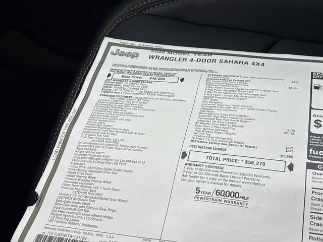 First Chrysler Dodge Jeep is pumped up to offer this attractive-looking and fun 2026 Jeep Wrangler Sahara in 41 Beautifully equipped with Quick Order Package 22G, Sahara Popular Equipment Group (12.3" Touchscreen Display, 4G LTE Wi-Fi Hot Spot, Alpine Premium Audio System, Apple CarPlay, Auto High Beam Headlamp Control, Auto-Dimming Rear-View Mirror, Blind Spot and Cross Path Detection, Connected Travel and Traffic Services, Connectivity - US/Canada, For More Info, Call 800-643-2112, Google Android Auto, GPS Navigation, Hard Seat Back, HD Radio, Integrated Center Stack Radio, Integrated Off-Road Camera, Integrated Voice Command with Bluetooth, Leather Wrapped Park Brake Handle, Leather Wrapped Shift Knob, McKinley Trimmed Seats, ParkSense Rear Park Assist System, Power 4-Way Driver Lumbar Adjust, Power 4-Way Passenger Lumbar Adjust, Power Adjust 8-Way Driver Seat, Power Adjust 8-Way Front Passenger Seat, Radio: Uconnect 5 Navigation with 12.3" Display, Side Steps, SiriusXM Radio Service, SiriusXM with 360L, and Universal Garage Door Opener), 3.45 Overall Top Gear Ratio, 4-Wheel Disc Brakes, 8 Speakers, ABS brakes, Air Conditioning, Alloy wheels, AM/FM radio: SiriusXM with 360L, Apple CarPlay/Android Auto, Automatic temperature control, Aux Battery, Body Color 3-Piece Hard Top, Brake assist, Cloth Low-Back Bucket Seats, Compass, Cruise Control, Delay-off headlights, Driver door bin, Driver vanity mirror, Dual front impact airbags, Dual front side impact airbags, Electronic Stability Control, Emergency communication system: Jeep Connect, Freedom Panel Storage Bag, Front anti-roll bar, Front Bucket Seats, Front Center Armrest w/Storage, Front dual zone A/C, Front fog lights, Front License Plate Bracket, Front reading lights, Fully automatic headlights, Heated door mirrors, Heated front seats, Heated steering wheel, Heavy Duty Suspension with Gas Shocks, Illuminated entry, Integrated roll-over protection, Low tire pressure warning, MOPAR All-Weather Floor Mats, Myflexcare Service Plan, No Soft Top, Non-Lock Fuel Cap Without Discriminator, Occupant sensing airbag, Outside temperature display, Overhead airbag, Panic alarm, ParkView Rear Back-Up Camera, Passenger door bin, Passenger vanity mirror, Power door mirrors, Power steering, Power windows, Radio data system, Radio: Uconnect 5 with 12.3" Display, Rear anti-roll bar, Rear reading lights, Rear Window Defroster, Rear Window Wiper/Washer, Remote keyless entry, Security system, Split folding rear seat, Steering wheel mounted audio controls, Stop-Start Dual Battery System, Tachometer, Telescoping steering wheel, Tilt steering wheel, Traction control, Trip computer, Variably intermittent wipers, Voltmeter, Wheels: 18" x 7.5 Machine/Painted Gray, and Wheels: 18" x 7.5" Machine/Painted Gray!